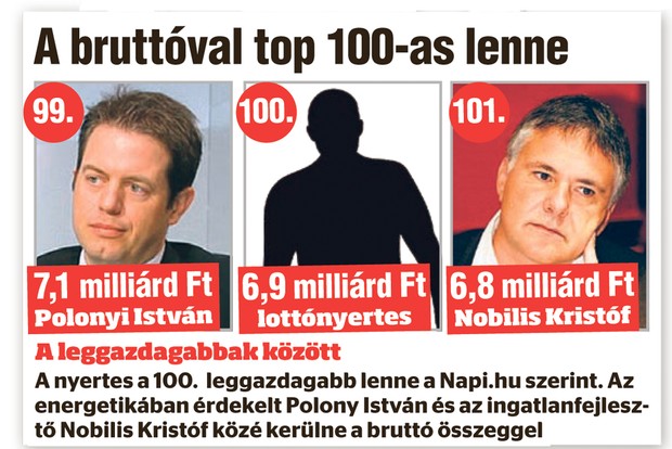 A nyertes a 100. leggazdagabb lenne a Napi.hu szerint. Az energetikában érdekelt Polony István és az ingatlanfejlesztő Nobilis Kristóf közé kerülne a bruttó összeggel